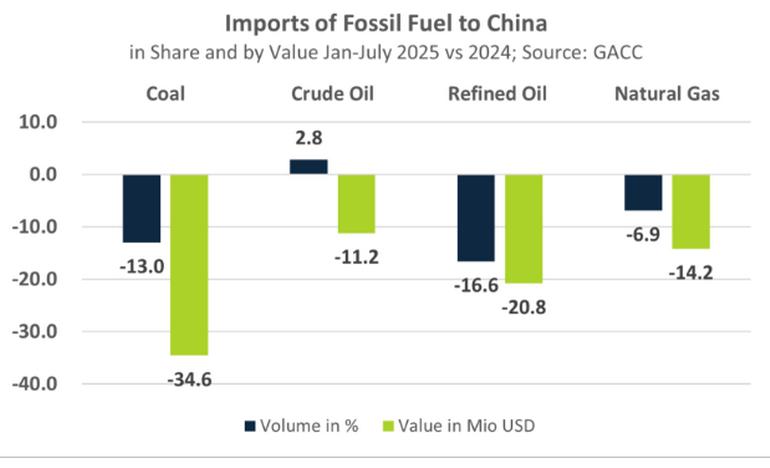Einen Lichtblick bieten die Rohstoffimporte. Kohle, Öl und Gas werden seit Monaten zu niedrigeren Preisen eingeführt. Im Juli sank der Kohlebedarf zusätzlich durch eine hohe Nutzung der Wasserkraft, was die Kohleimporte im Jahresvergleich um 11 bis 13 Prozent verringerte. Gasimporte nahmen ebenfalls ab.